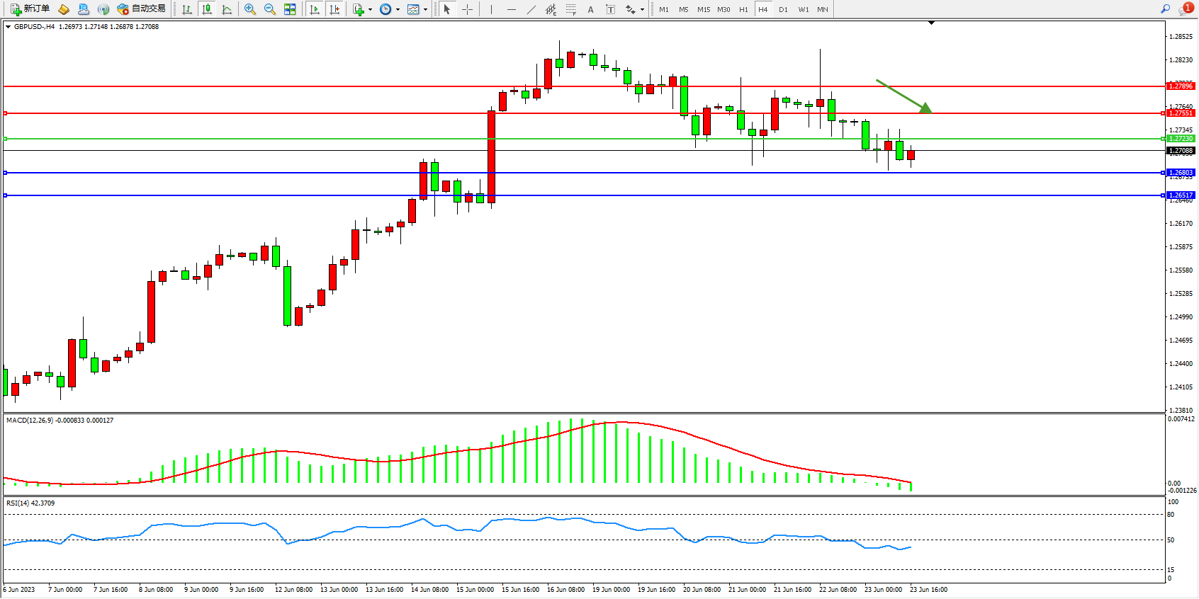 交易策略:1.27230下方看跌,目标1.26803  1.26517
